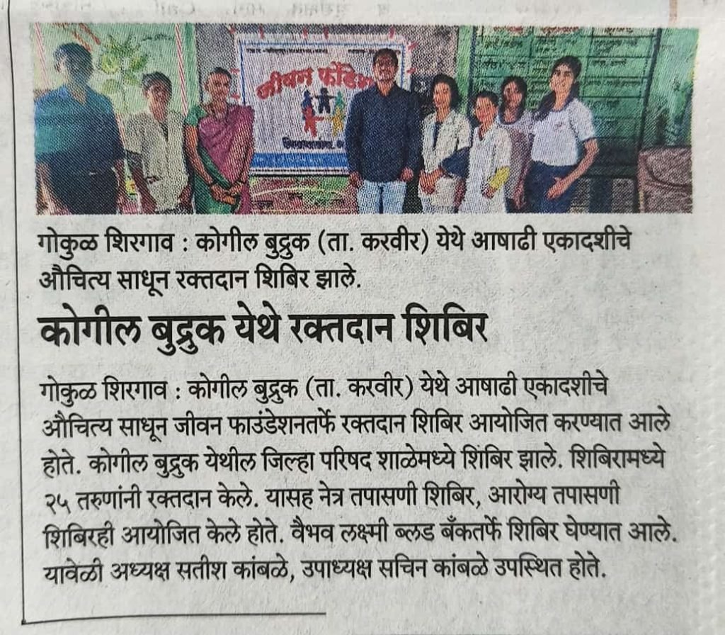 रक्तदान शिबिर दिनांक – 15/07/2024. ई रोजी स्थळ – कोगील बुद्रुक ता-करवीर कोल्हापूर. या ठिकाणी फौंडेशन कडून आषाढी एकादशी निमित्त रक्तदान शिबिर व आरोग्य शिबिर घेण्यात आले.